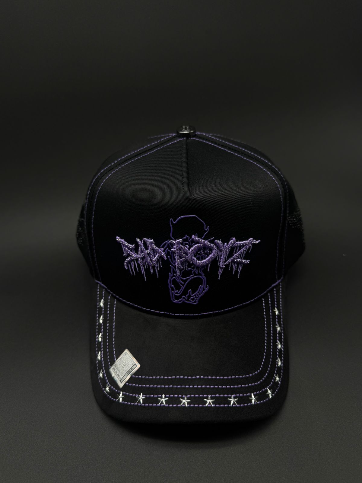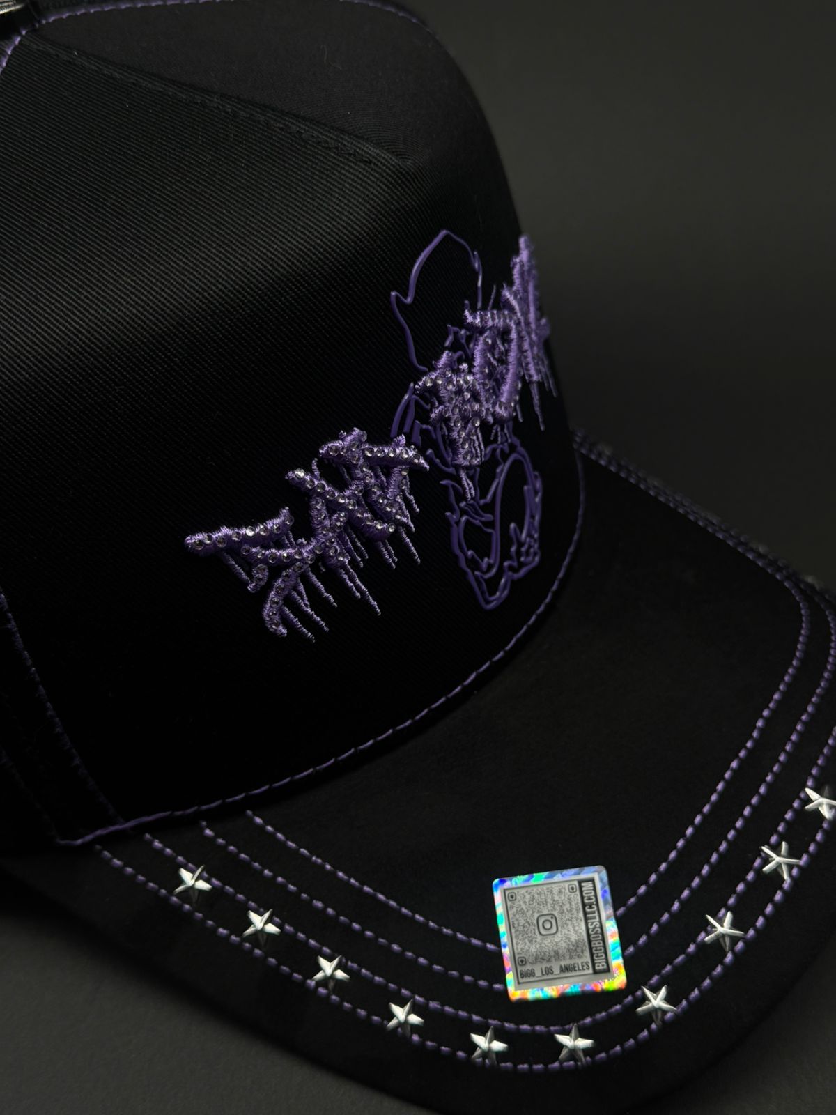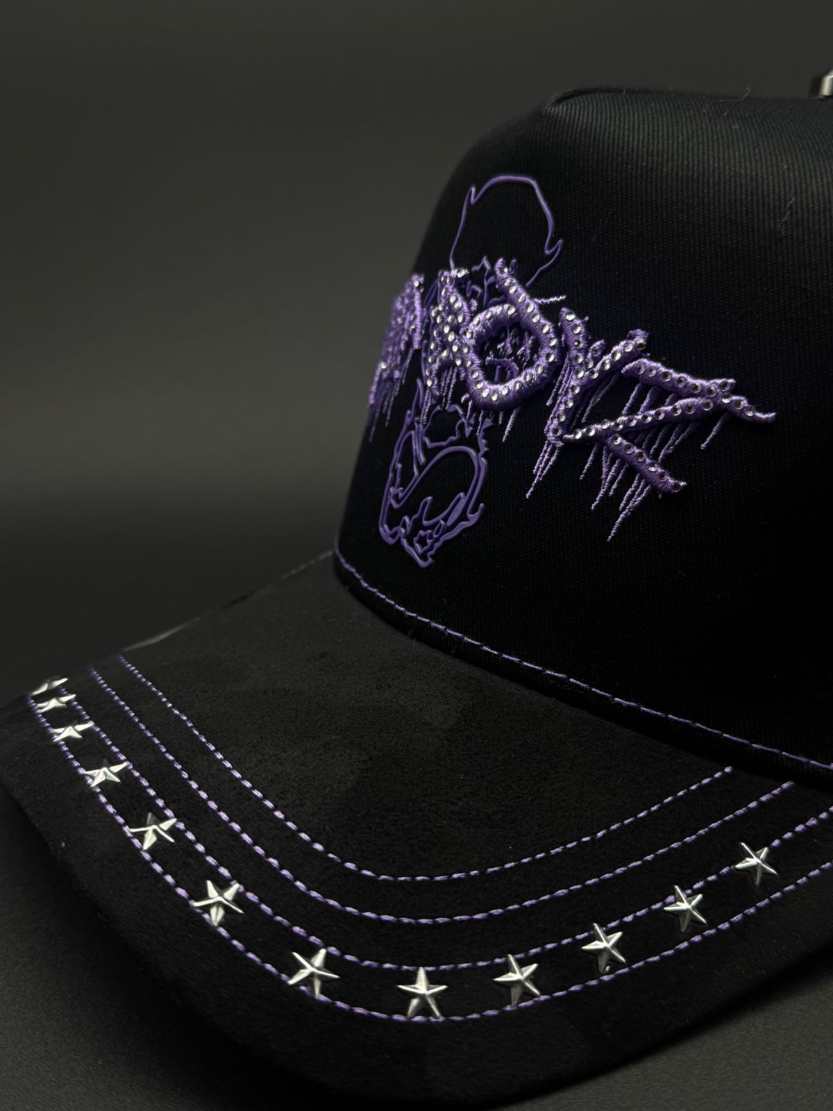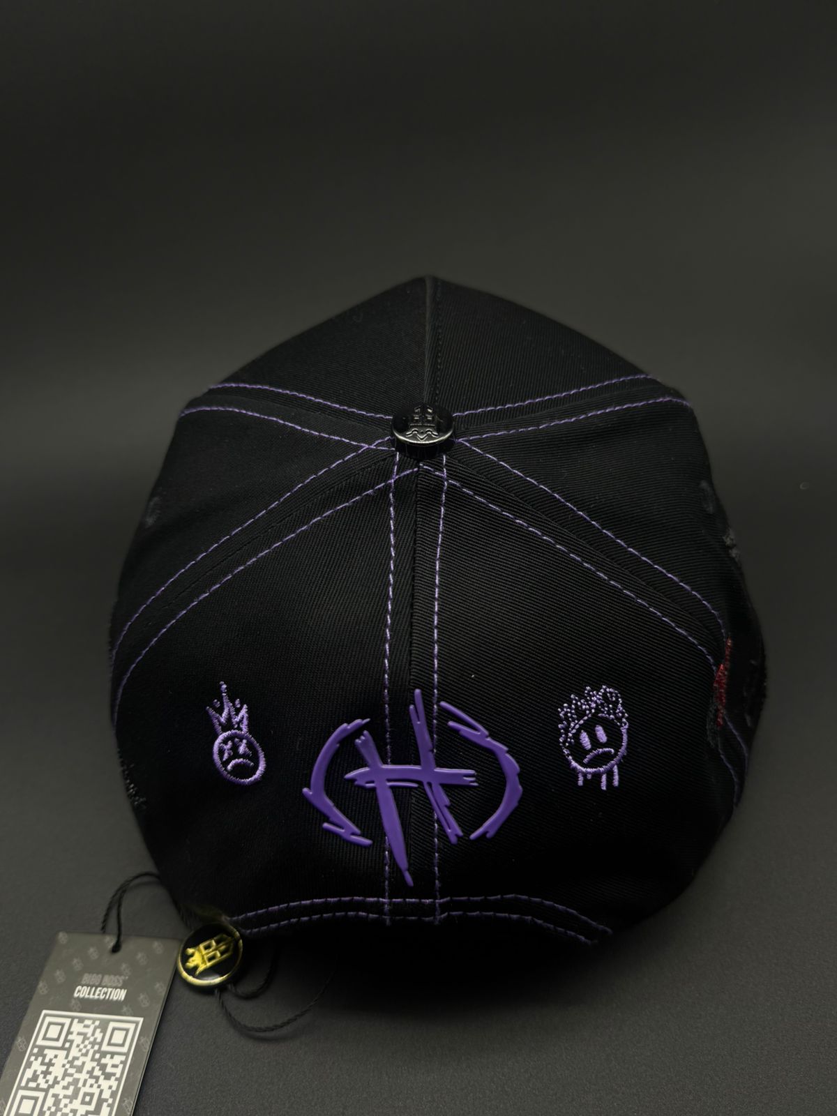 Gorra BIG BOSS X SAD BOYS con diseño premium y detalles meticulosos. Presenta bordado frontal en morado con pedrería brillante, acompañado de detalles de gamuza morado en la visera que complementan la joyería. Los laterales lucen pedrería en negro y rojo, mientras que la parte trasera destaca la icónica letra H con detalles de caras. Cada elemento está cuidadosamente ejecutado para un acabado de alta calidad que refleja el estilo distintivo de la colección.