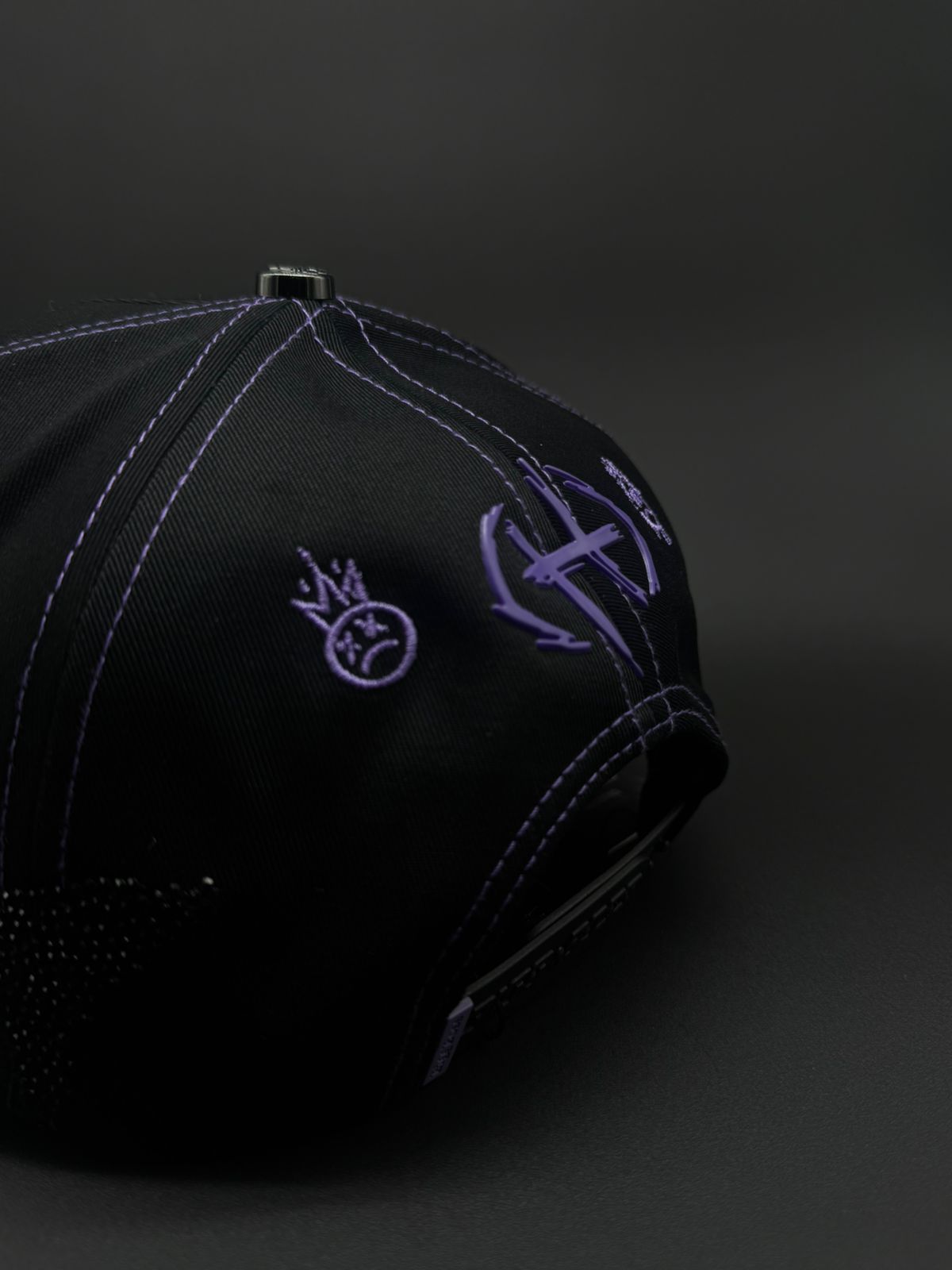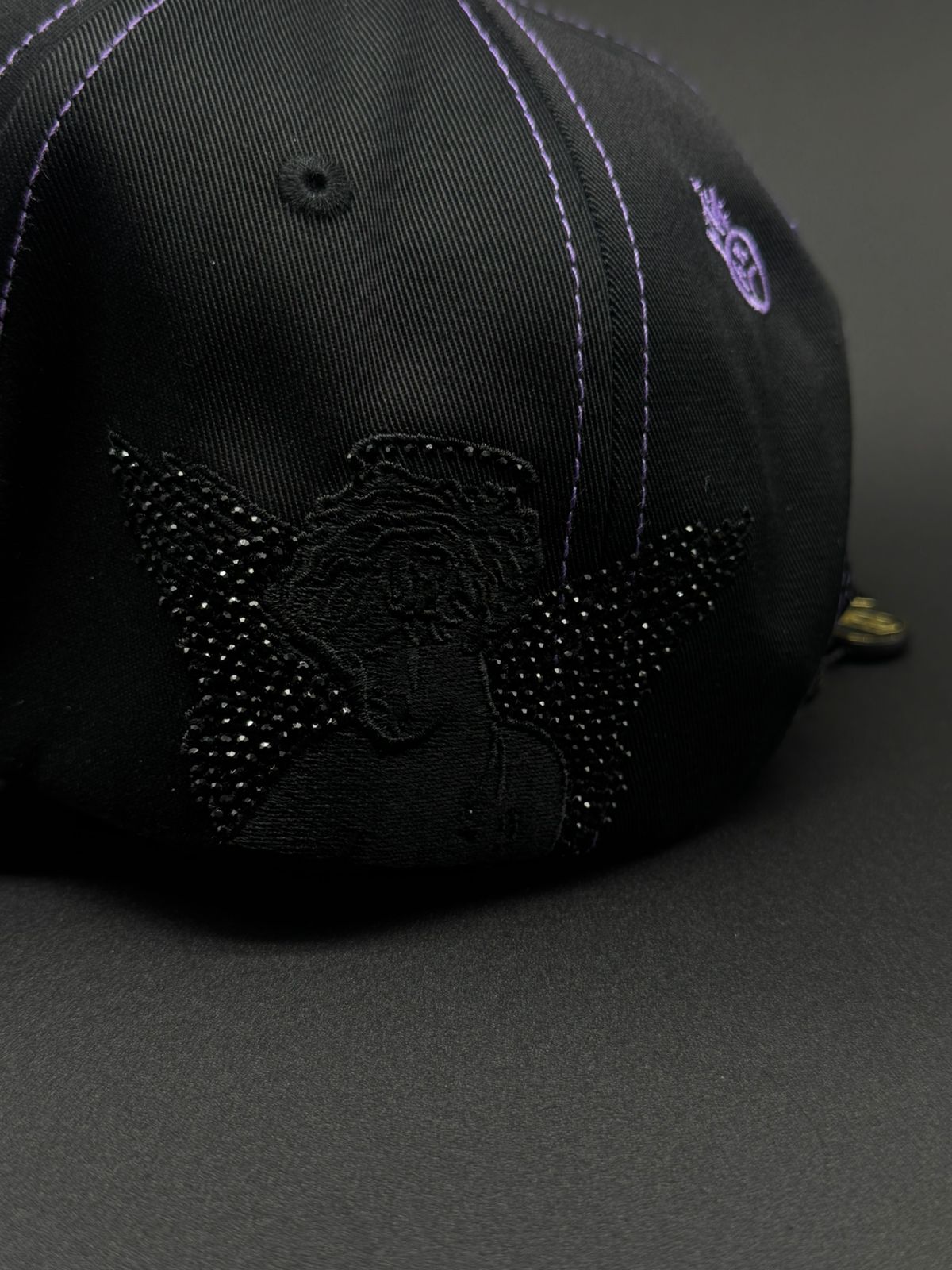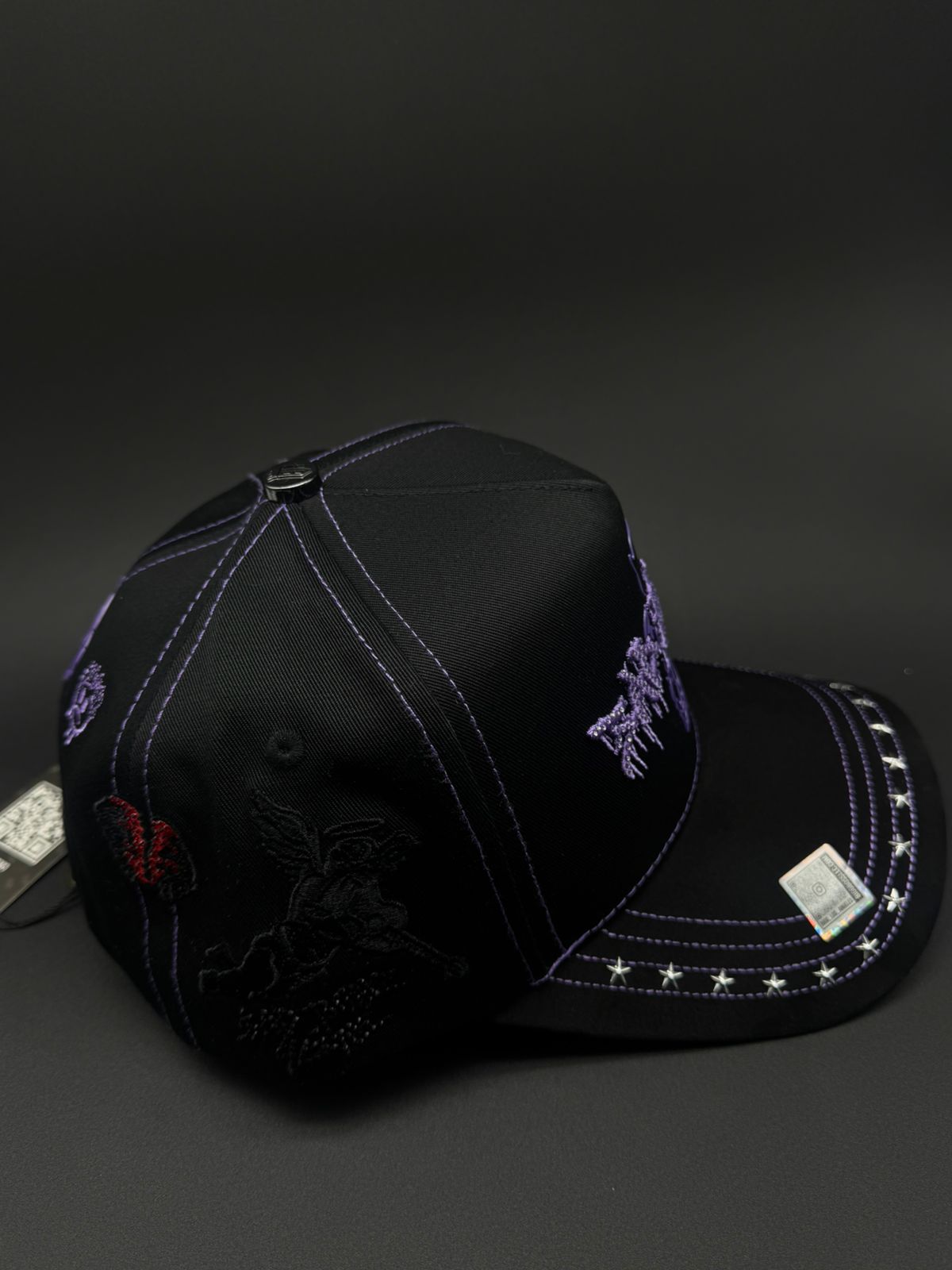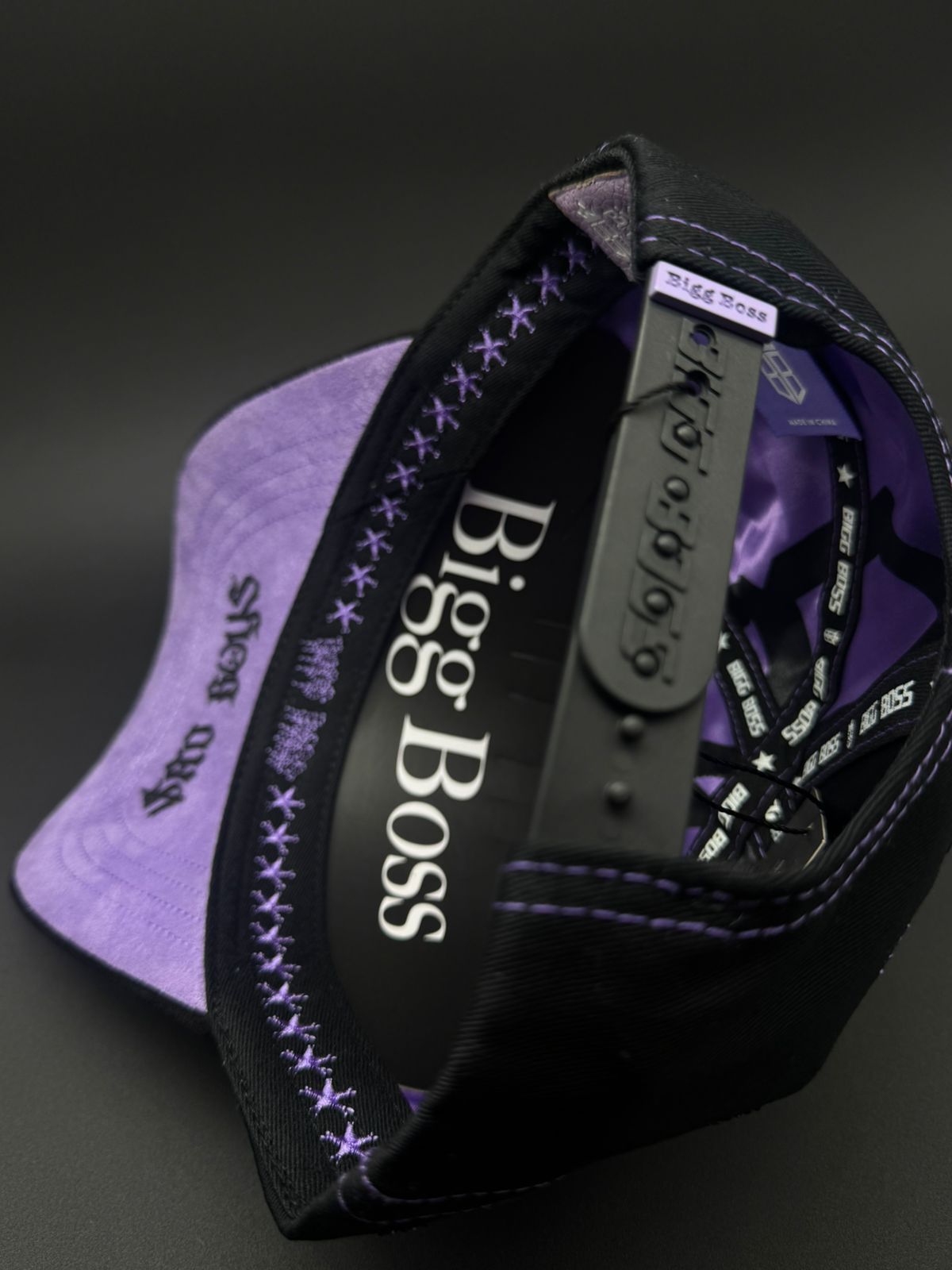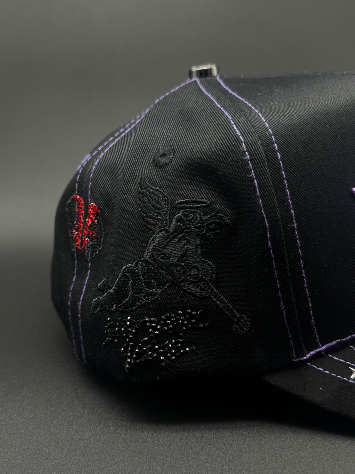 Gorra BIG BOSS X SAD BOYS con diseño premium y detalles meticulosos. Presenta bordado frontal en morado con pedrería brillante, acompañado de detalles de gamuza morado en la visera que complementan la joyería. Los laterales lucen pedrería en negro y rojo, mientras que la parte trasera destaca la icónica letra H con detalles de caras. Cada elemento está cuidadosamente ejecutado para un acabado de alta calidad que refleja el estilo distintivo de la colección.