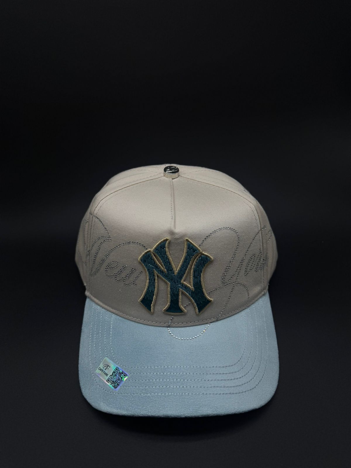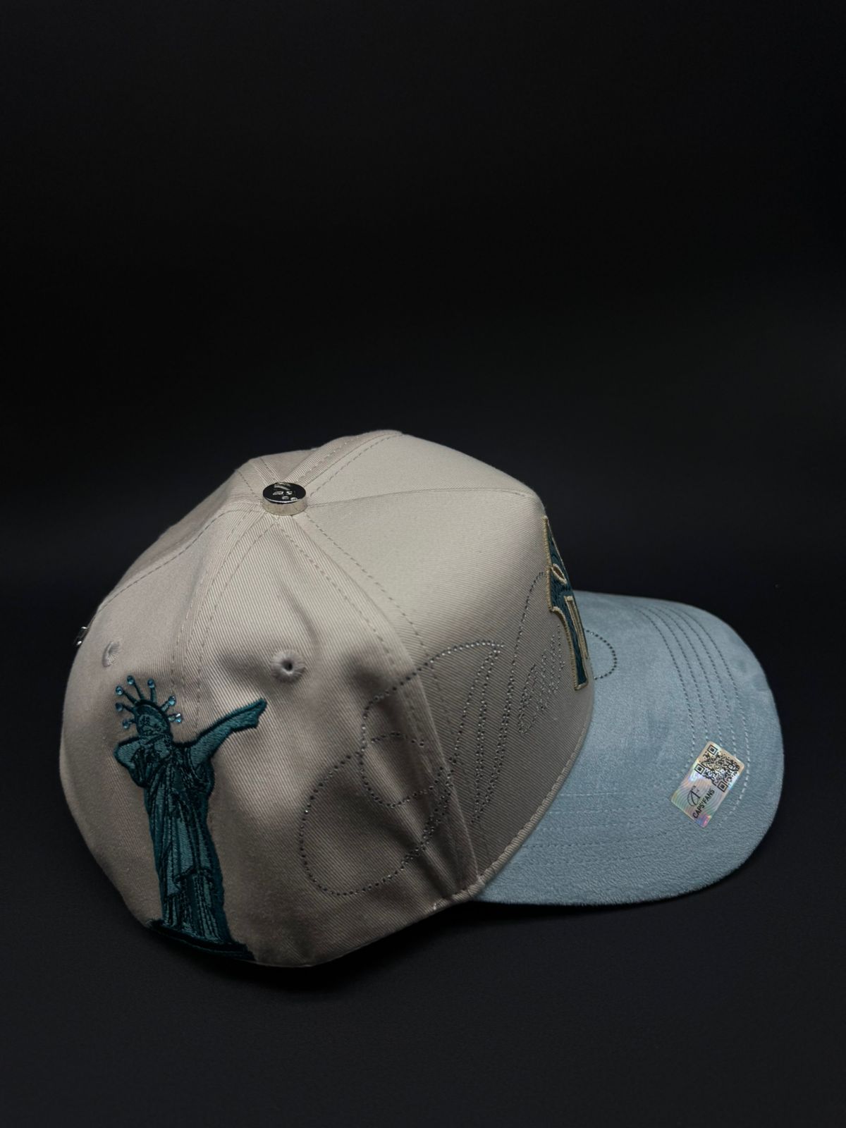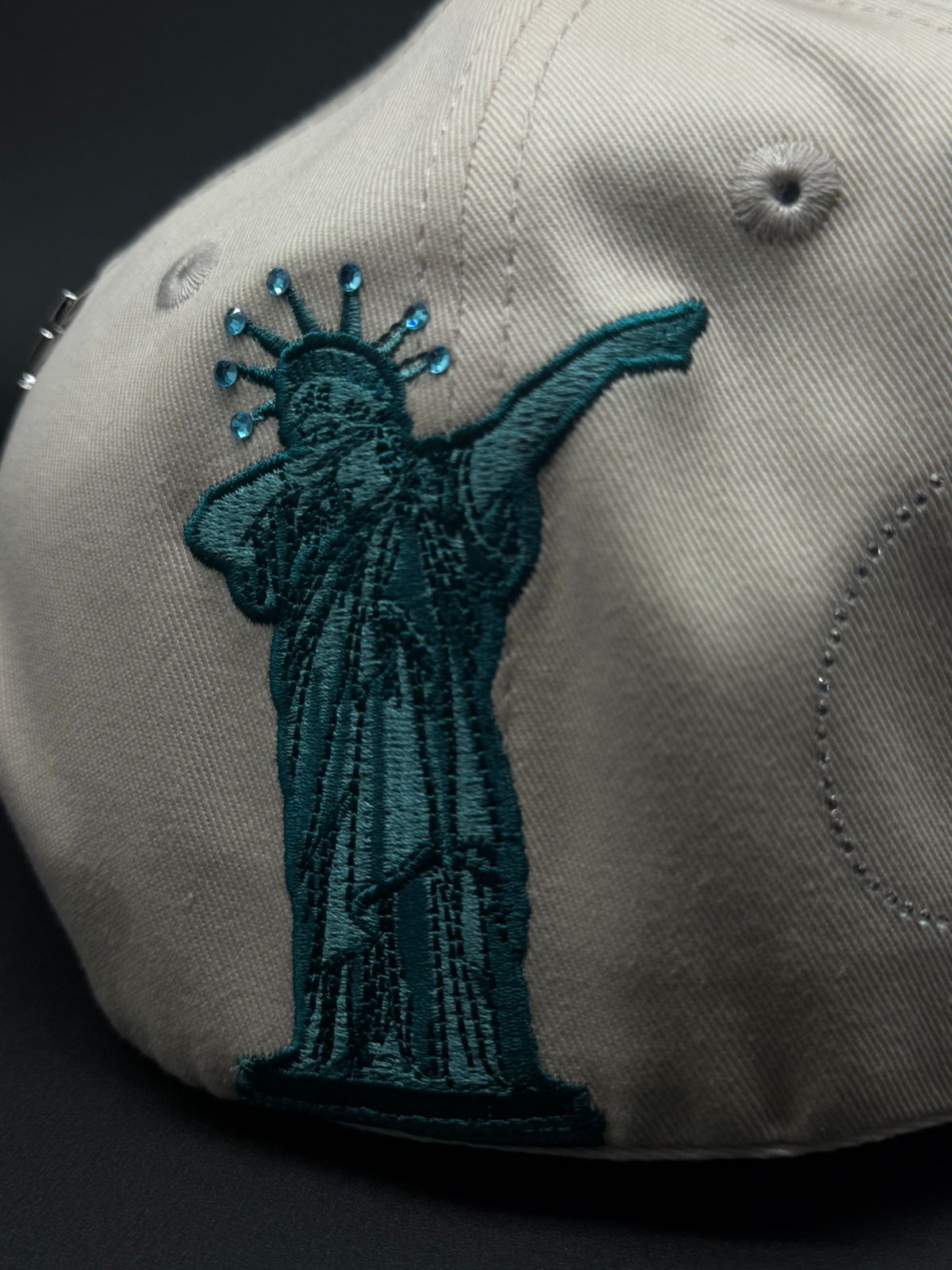 Gorra New York de alta calidad con detalles premium que reflejan el icónico estilo urbano. Presenta bordado frontal con pedrería que destaca el texto "NEW YORK", complementado con un elegante bordado lateral de la Estatua de la Libertad. Confeccionada en gamuza suave, cuenta con placa de logo de marca en la visera y en el interior. El forro azul de calidad superior añade durabilidad y confort. Cada elemento está cuidadosamente diseñado para garantizar una prenda de lujo que combina estética y funcionalidad.