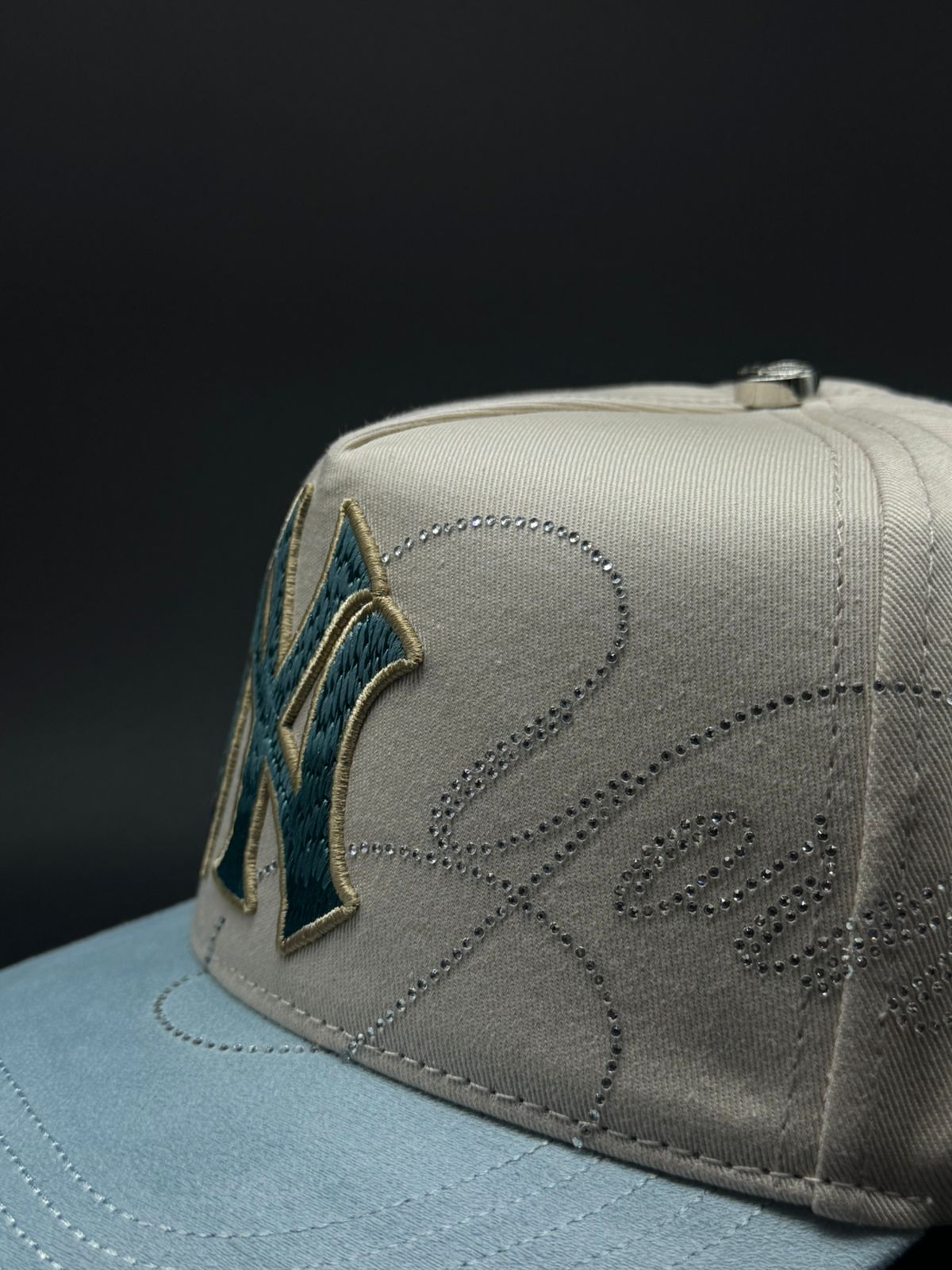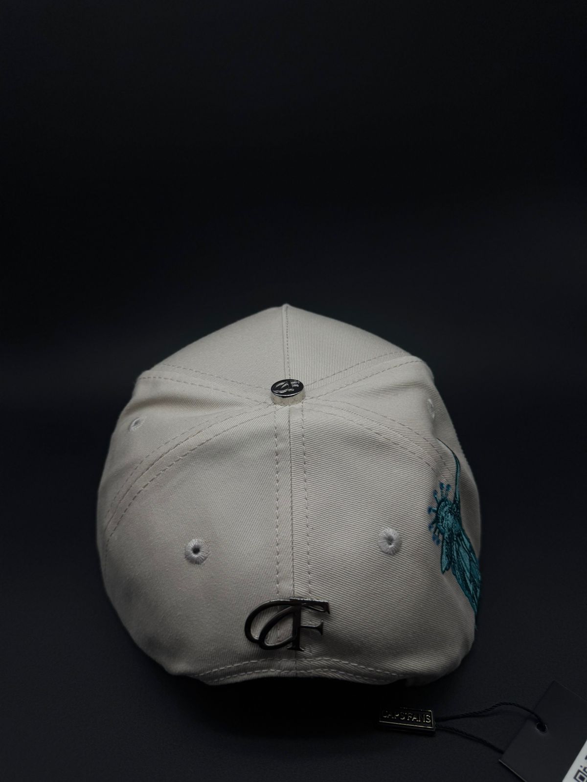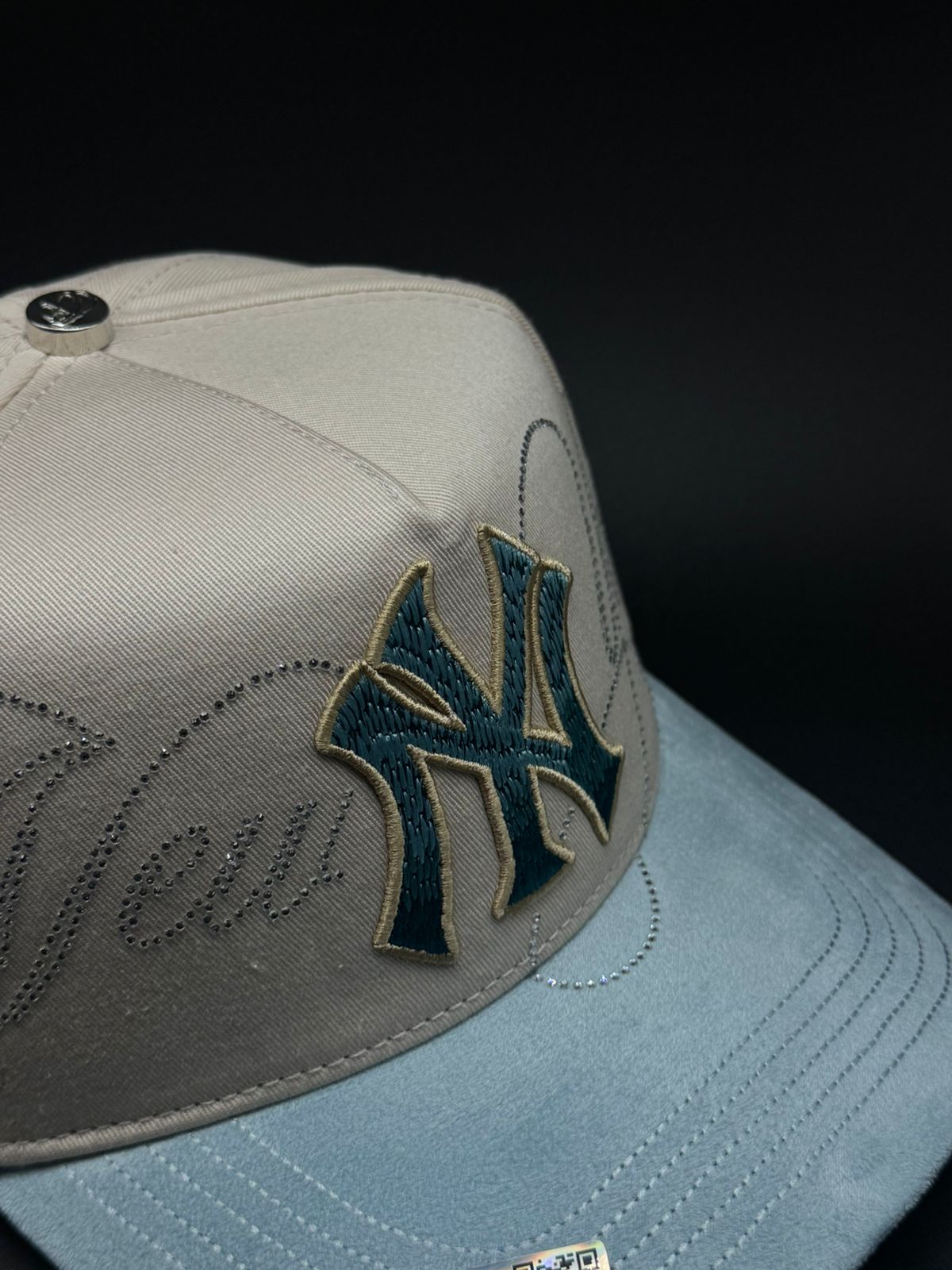 Gorra New York de alta calidad con detalles premium que reflejan el icónico estilo urbano. Presenta bordado frontal con pedrería que destaca el texto "NEW YORK", complementado con un elegante bordado lateral de la Estatua de la Libertad. Confeccionada en gamuza suave, cuenta con placa de logo de marca en la visera y en el interior. El forro azul de calidad superior añade durabilidad y confort. Cada elemento está cuidadosamente diseñado para garantizar una prenda de lujo que combina estética y funcionalidad.