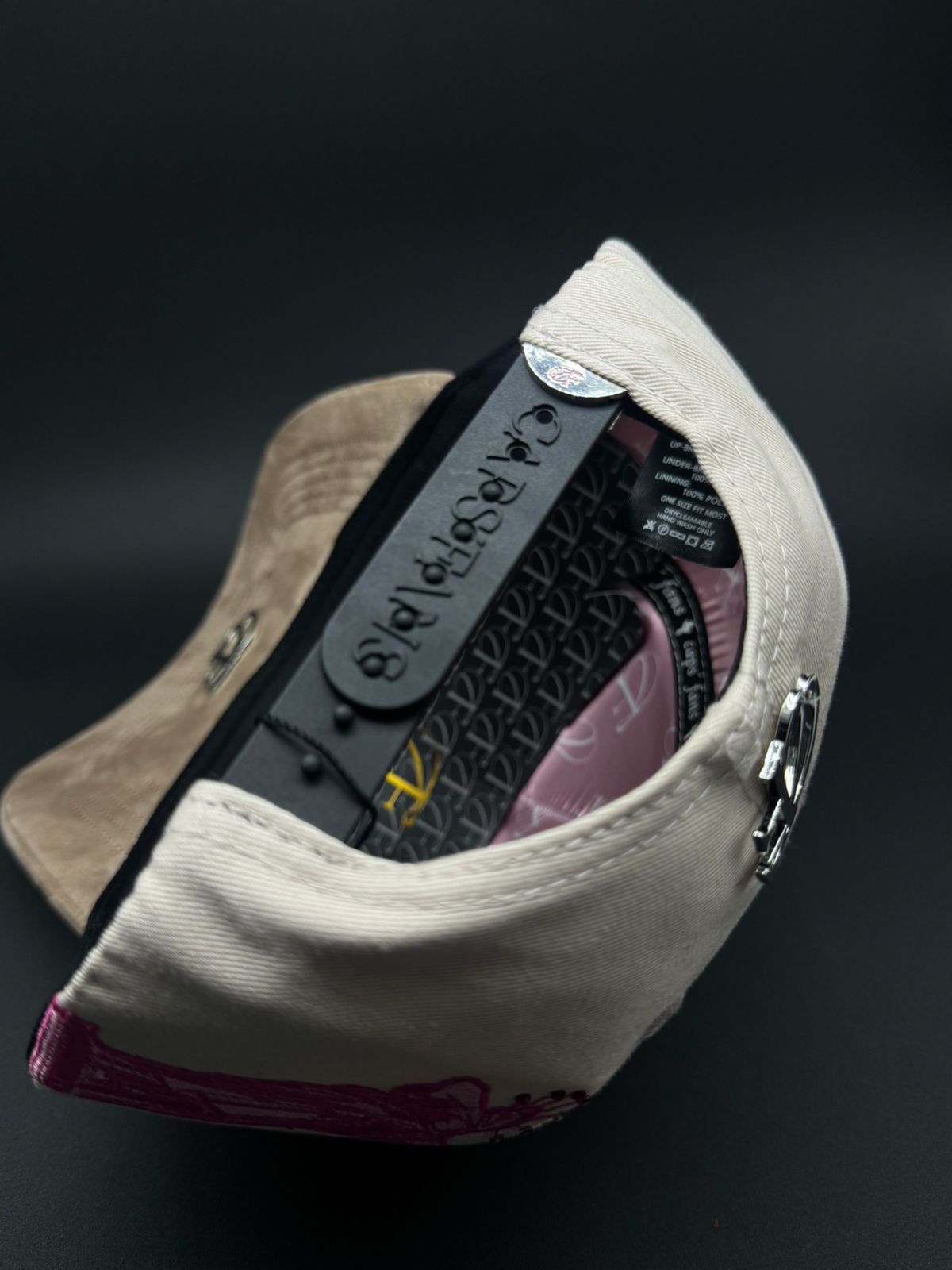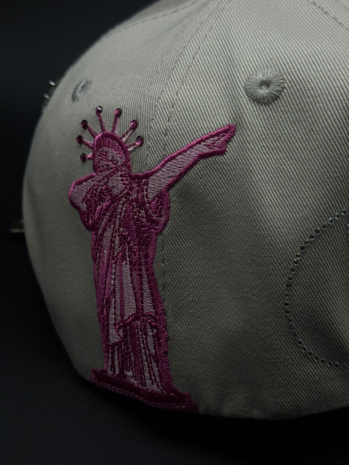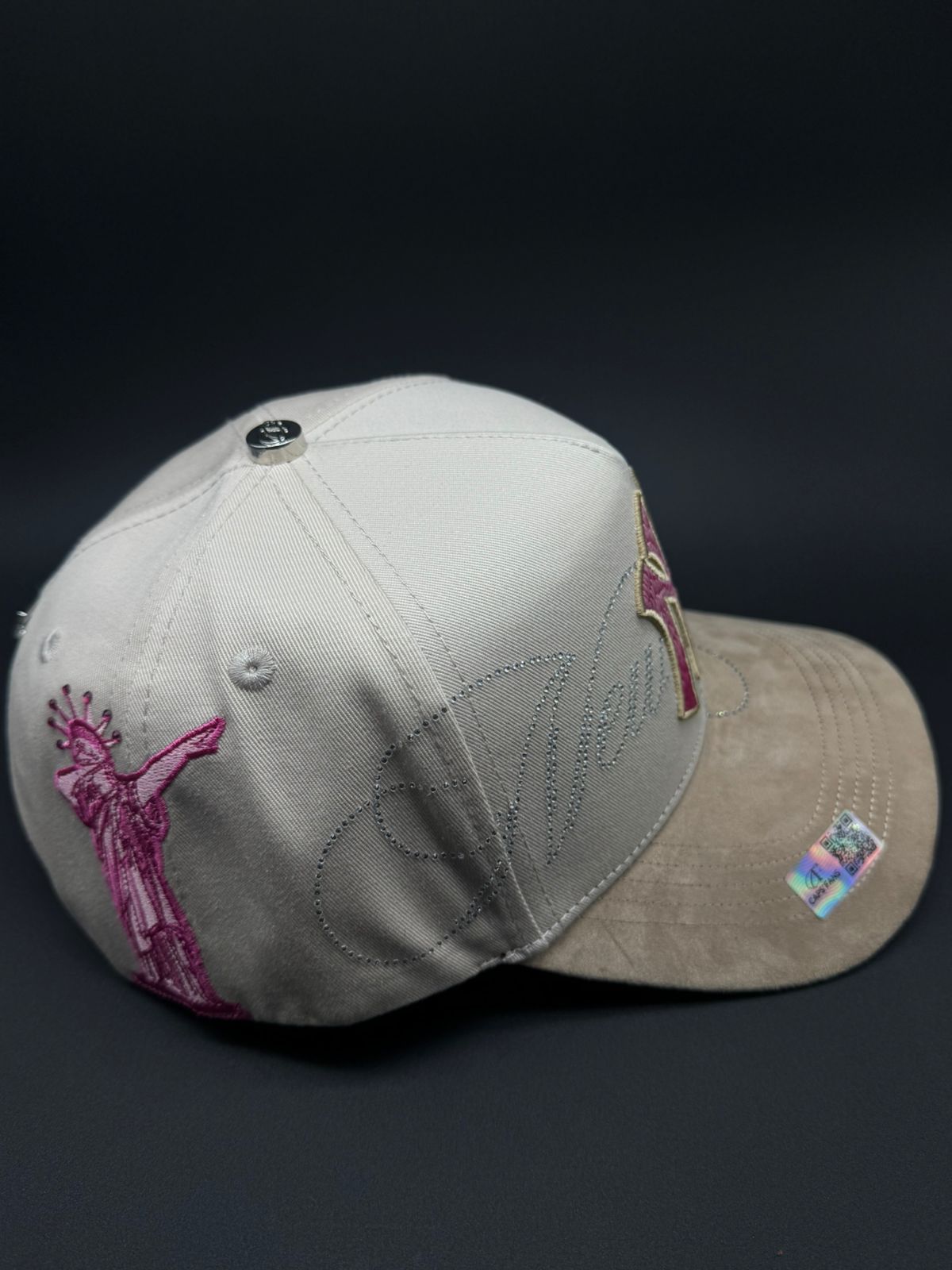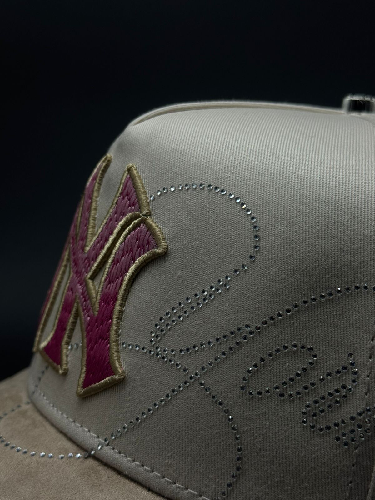 Gorra New York en tonalidad rosa con acabados de lujo que reflejan la esencia de la Gran Manzana. Destaca por su bordado NY acompañado de detalles en pedrería que añaden brillo y sofisticación. La visera cuenta con aplicación de gamuza premium que eleva significativamente su calidad, mientras que placas metálicas con las iniciales de la marca adornan tanto la parte frontal como trasera. Un bordado de la Estatua de la Libertad en el lateral completa este diseño iconico.