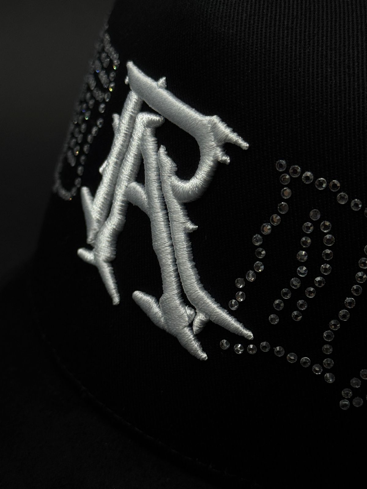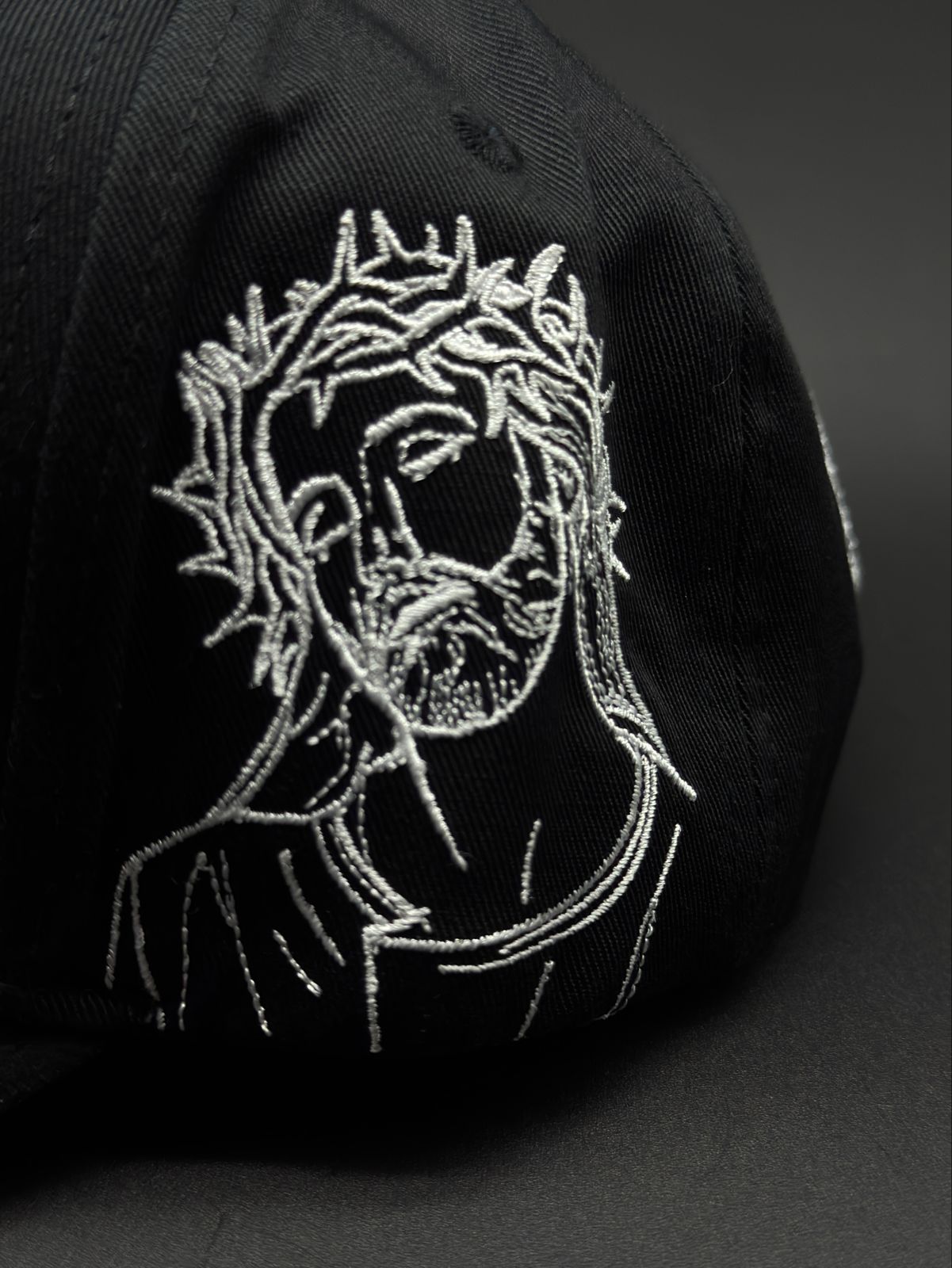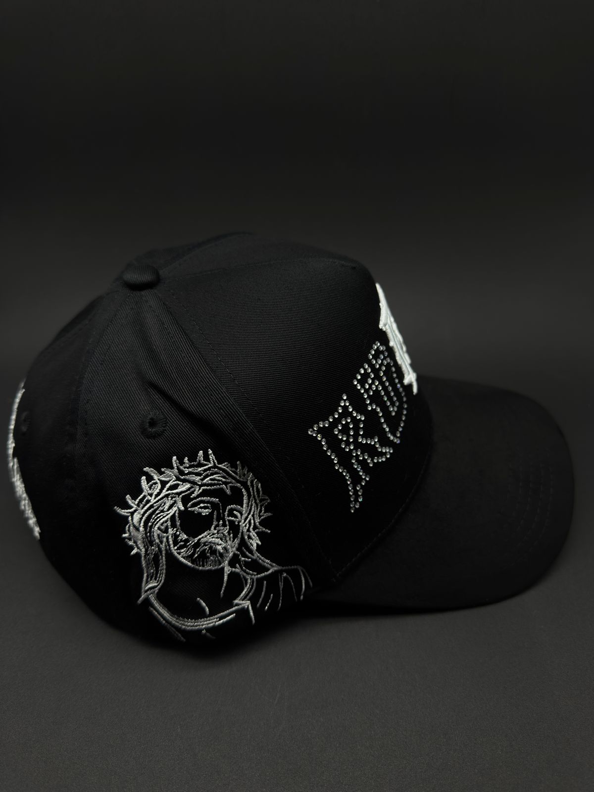 Gorra RUDE AWAKENINGS con bordado frontal en blanco que captura la esencia de la marca, complementado con pedrería brillante que añade un toque de elegancia. El diseño trasero presenta un detalle bordado de Cristo, reflejando un mensaje espiritual profundo. La visera inferior cuenta con un versículo bíblico, convirtiendo esta prenda en una declaración de fe y estilo. Cada elemento está cuidadosamente ejecutado para ofrecer una pieza unica